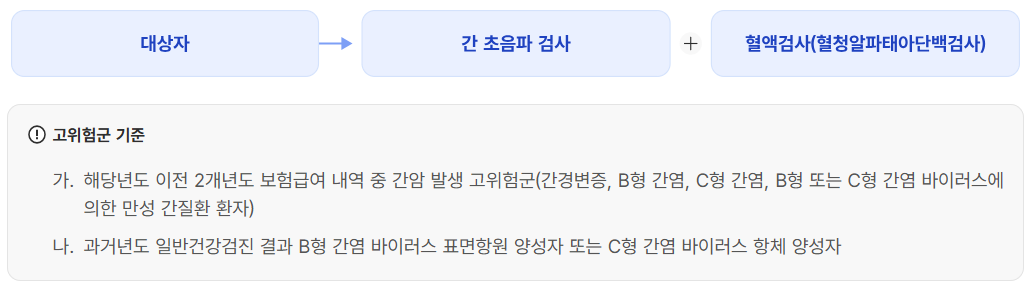 - 간암 : 만 40세 이상 고위험군 (6개월 1회, 간초음파 + 혈청알파태아단백검사)