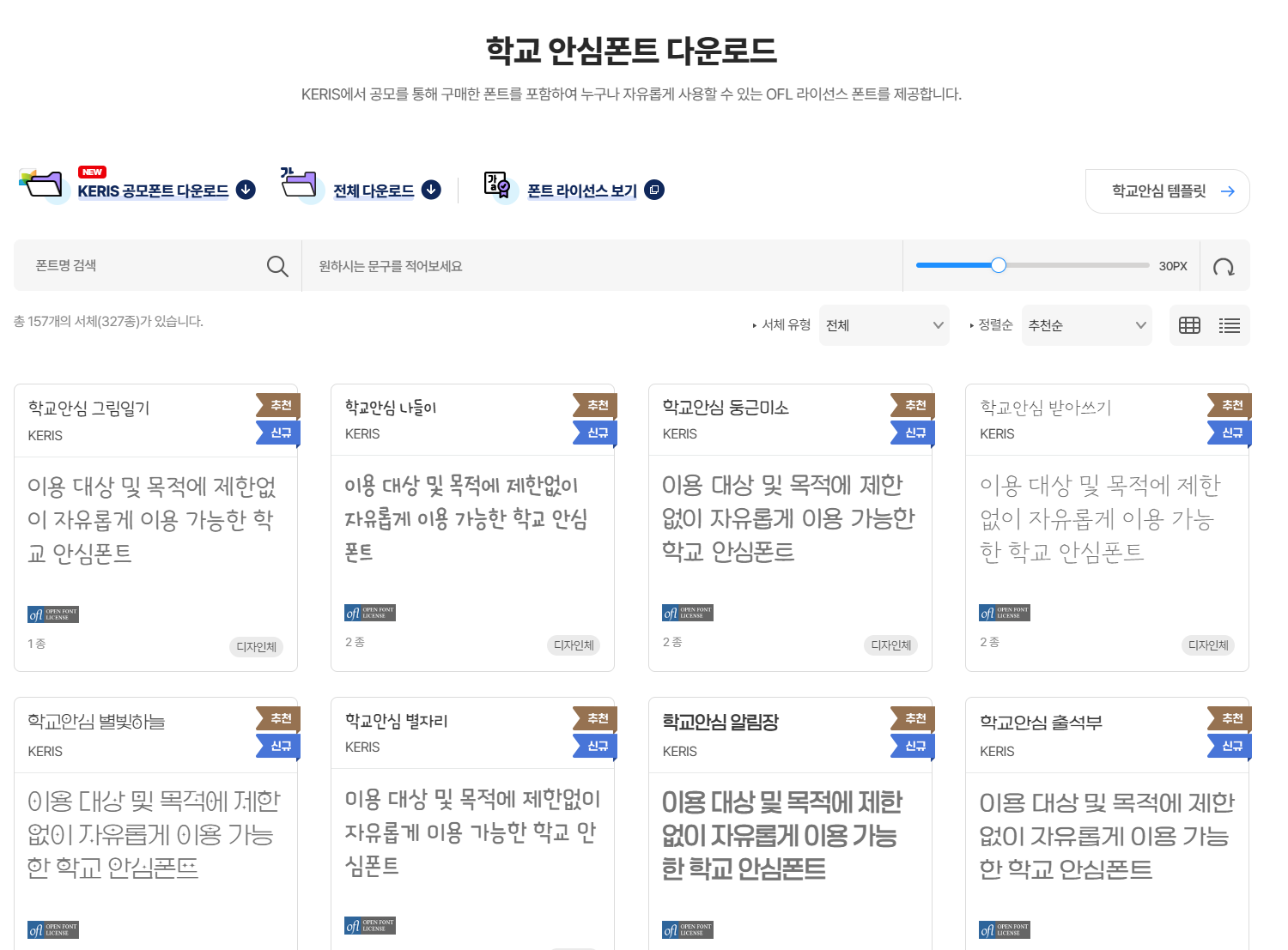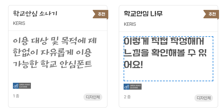 대표적인 무료 폰트 배포처 중 하나가 교육저작권지원센터(한국교육학술정보원)입니다. 이곳에서 제공하는 '학교안심폰트'는 개인, 기업, 공공기관 모두 자유롭게 쓸 수 있고 출처 표기조차 필요 없습니다.