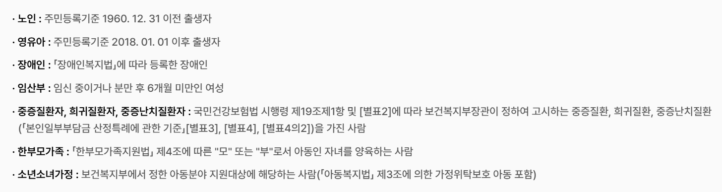 ① 수급자 유형 : 생계급여, 의료급여, 주거급여, 교육급여 수급자 및 차상위계층 (한부모가정 포함)