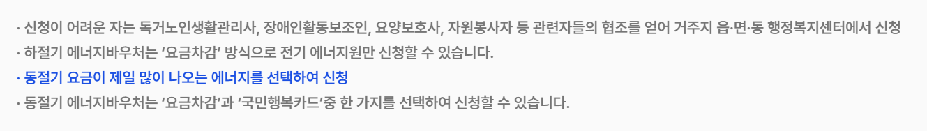 ※25년부터는 지원금액이 동·하절기 구분없이 사용기간 내 자유롭게 사용 가능하므로, 하절기에 바우처를 사용하지않고, 동절기에 몰아서 사용하기를 희망하는 경우에는 하절기 요금 미차감 신청 필요